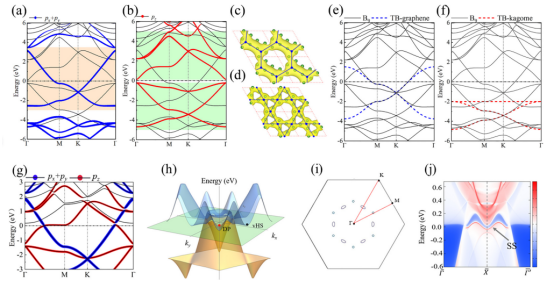 图4:(a) 单层B9的px+py轨道投影能带,(b) 单层B9的pz轨道投影能带, (c)、(d) 类石墨烯和隐式笼目晶格平带的波函数在K点的投影,(e)、(f) 使用紧束缚模型构建类石墨烯能带和笼目平带与单层B9能带的对比。(g) 单层KB9的p轨道投影能带。(h) 单层KB9的三维能带结构。(i) 单层KB9的费米面以及(01)方向的表面态投影。