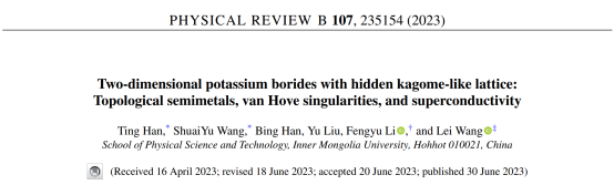 近日,我院李锋钰教授与王磊研究员指导研究生在寻找二维本征拓扑超导材料领域取得新进展,相关成果以“Two-dimensional potassium borides with hidden kagome-like lattice: Topological semimetals, van Hove singularities, and superconductivity”为题发表在物理学知名期刊Physical Review B(《物理学评论B》)上。
