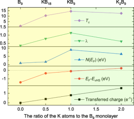 图5:转移电荷(从K原子到B9单层)、费米能级处的态密度[N(EF)]、电子-声子耦合常数(λ)、超导转变温度(Tc)以及范霍夫奇点(EvHS)和费米能级(EF)的能量差随K原子数与B9单层的比值的变化曲线。
