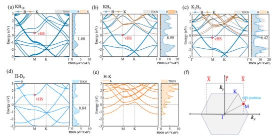 图3:(a) KB18、(b) KB9、(c) K2B9、(d) B9和 (e) 钾六角晶格的投影能带结构及电子态密度图。(f) 五种化合物的第一布里渊区及沿(01)方向的一维投影布里渊区示意图。