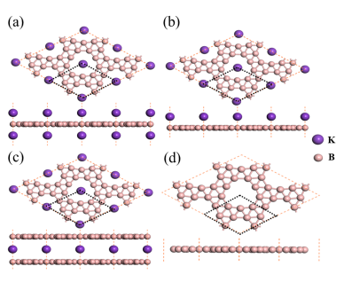 该工作中,通过第一性原理与全局结构搜索结合的方式,预测了一种新的具有拓扑态的二维超导K-B材料体系。通过调节这些材料中的K原子和B9单层的比例可以将隐式笼目晶格中的范霍夫奇点调控到费米面附近,从而提高了材料费米能级处的电子态密度,进而在该体系里同时实现拓扑性和超导性。本研究不仅揭示了B9层的轨道特性在隐式笼目型硼化钾晶格中的关键作用,而且提出了一种实现拓扑性和超导性共存的策略,从而为实现奇异物理开辟了可能性。