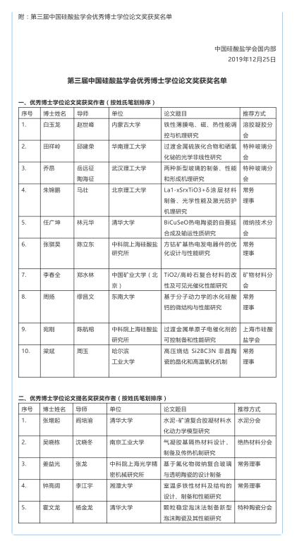 为鼓励创新、加强高层次创新人才的培养工作、提高我国博士研究生的教育质量,根据《中国硅酸盐学会优秀博士学位论文评选办法(试行)》,中国硅酸盐学会近日完成了第三届中国硅酸盐学会优秀博士学位论文奖评选工作。学会将候选论文按研究领域分为储能材料、陶瓷材料、薄膜与涂层材料、其他无机非金属材料4个组开展专家评审,11位相关领域教授或研究员参与本次评审工作。经候选人推荐、专家分组评阅及打分等评审环节,我校yl23411集团官网赵世峰教授指导2018届博士毕业生白玉龙同学完成的博士学位论文“铁性薄膜电、磁、热性能调控与机理研究”荣获第三届中国硅酸盐学会优秀博士学位论文奖。