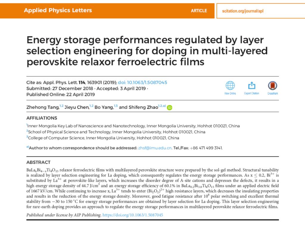 最近,由我院赵世峰教授指导的2017级博士研究生唐哲红,在多层钙钛矿弛豫铁电薄膜储能方面研究获得突破。相关成果发表在物理类TOP期刊Applied Physics Letters上,114(16), 163901(2019)。原文链接为:https://doi.org/10.1063/1.5087045。论文以“Energy storage performances regulated by layer selection engineering for doping in multi-layered perovskite relaxor ferroelectric films”为题,详细报道了赵世峰教授团队在多层钙钛矿结构中实现了层选位的稀土掺杂调控,从而实现多层钙钛矿弛豫铁电薄膜储能性能的有效调控。这个研究工作为多层状铁电薄膜的能量储存提供了一个新的工程方法。标志着该研究团队在应用物理学领域又取得了新的创新性成果。