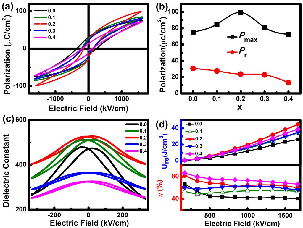 | 图 (a) BaLaxBi4-xTi4O15薄膜在1667 kV/cm电场下的电滞回线;(b) Pmax 和 Pr 随La3+含量的变化曲线; (c)介电常数 (εr)随电场在100kHz下的变化曲线; (d) BaLaxBi4-xTi4O15薄膜的Ure和η随电场的变化曲线. |