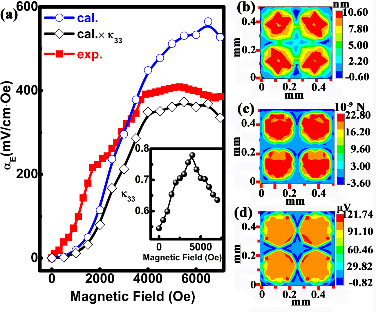 图 2 (a)计算与实验得到的磁电压系数,(b)表面位 移模拟,(c)表面应力模拟,(d)磁电压模拟 |