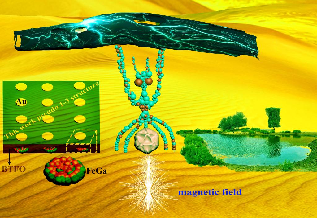 古人云“蚍蜉撼大树,可笑不自量”。由零维纳米材料—团簇组装的FeGa/Bi5Ti3FeO15纳米器件微加磁场,可获闪电之高压。正如图1中所绘蚍蜉(纳米蚂蚁)亦可撼树。该工作制备出团簇组装的赝1-3结构器件在室温下获得低场、高线性度的磁电耦合系数,8000 Oe下可达418 mV/cm∙Oe。对赝1-3结构器件进行多物理场模拟,进一步确定了多界面的应力耦合作用机理。该工作中团簇组装赝1-3结构器件设计策略和室温强磁电耦合数值在国际上尚属首例;其研究结果如同沙漠中出现的绿洲,为低成本磁电耦合传感器的市场应用提供了思路。论文以yl23411集团官网为唯一署名单位,作者依次为白玉龙(2015级博士研究生,完成样品制备和性能分析)、蒋宁(2017级硕士研究生,在数值模拟和图片设计中做出重要贡献)、赵世峰(yl23411集团官网教授,通讯作者)。该工作得到国家自然科学基金(Grant Nos. 11564028, 11264026)、内蒙古自治区国家杰出青年科学基金培育基金(Grant No. 2014JQ01)的支持。
