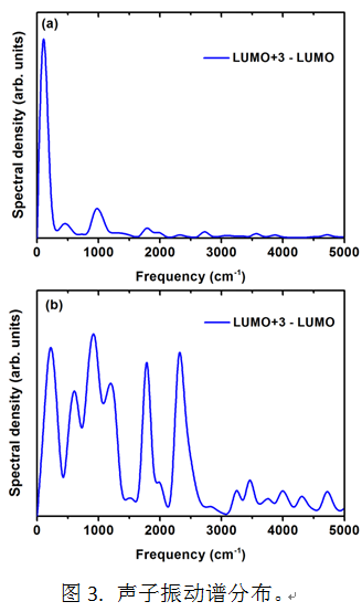在bottom-up合成过程中,通过对前驱分子的选择可控制合成的结构,如上图所示。实验证明,未掺杂和掺杂氮原子的结构可组成类似p-n结的器件。然而其电子结构的不同,会对光电子的寿命产生影响。计算结果表明两种结构中光激发电子的寿命有很大差异,掺杂后光电子寿命减小了约35%(图2)。进一步的计算表明,寿命的降低来源于掺杂结构较小的导带能级间距和较多的声子振动模式参与了电子的弛豫,如图3所示。