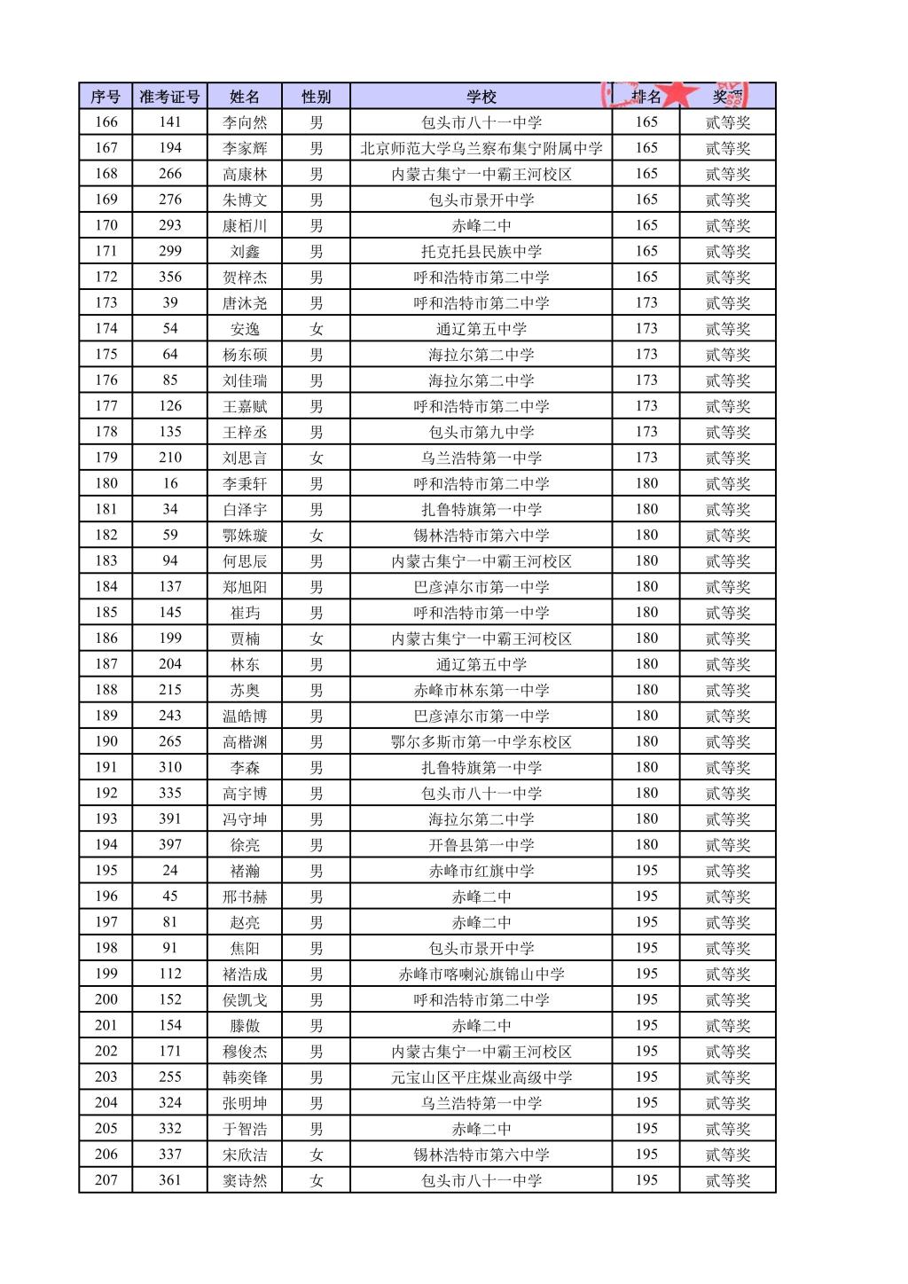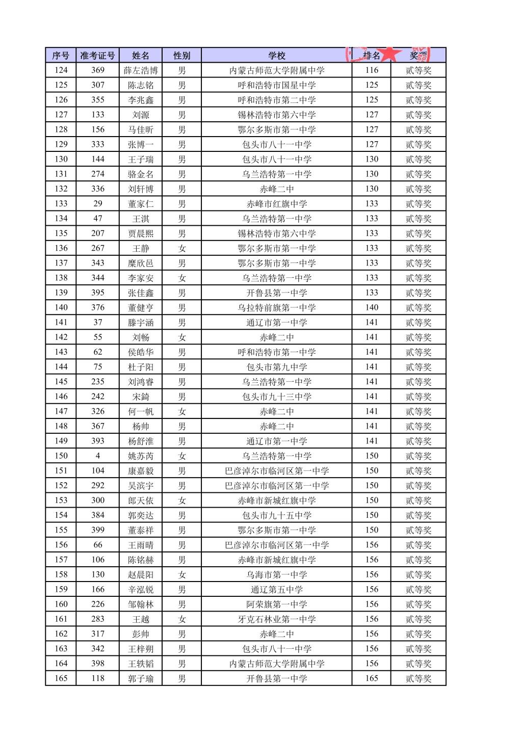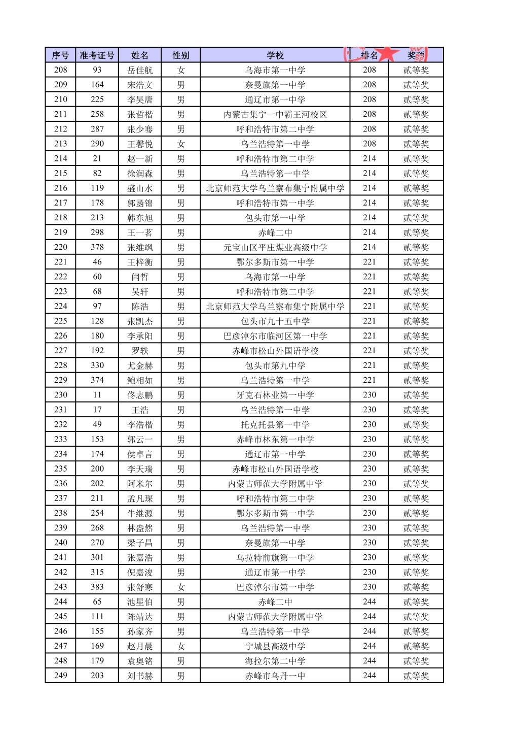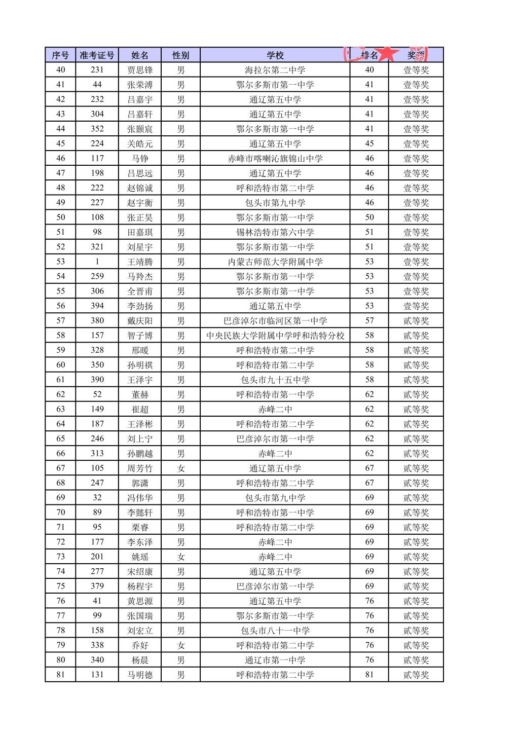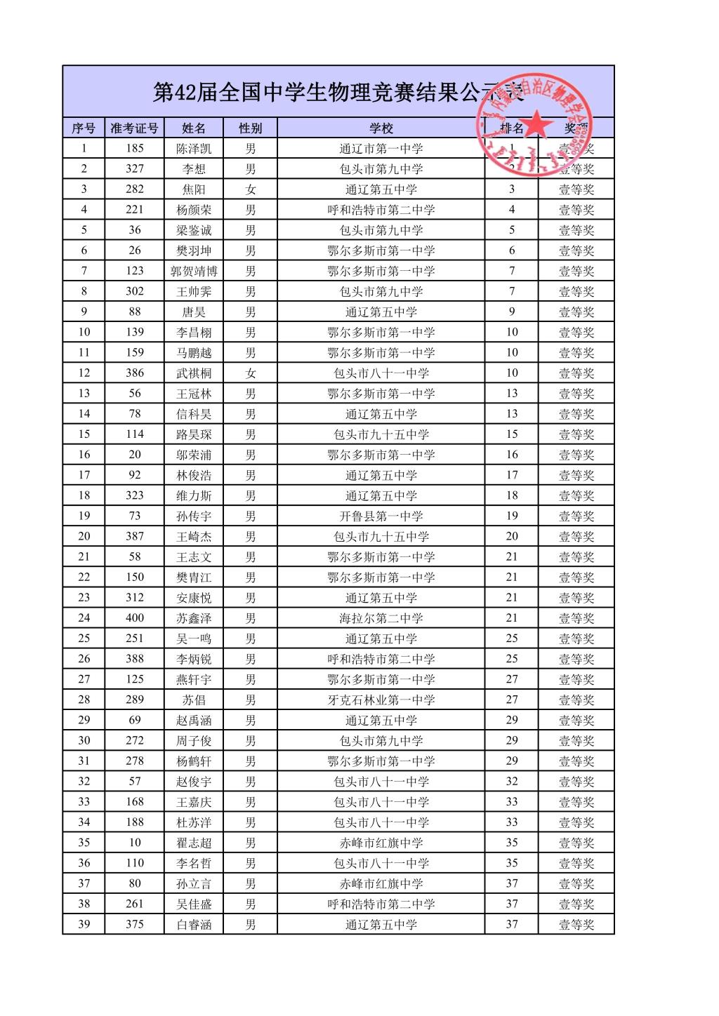 第42届全国中学生物理竞赛内蒙古自治区复赛结果公示