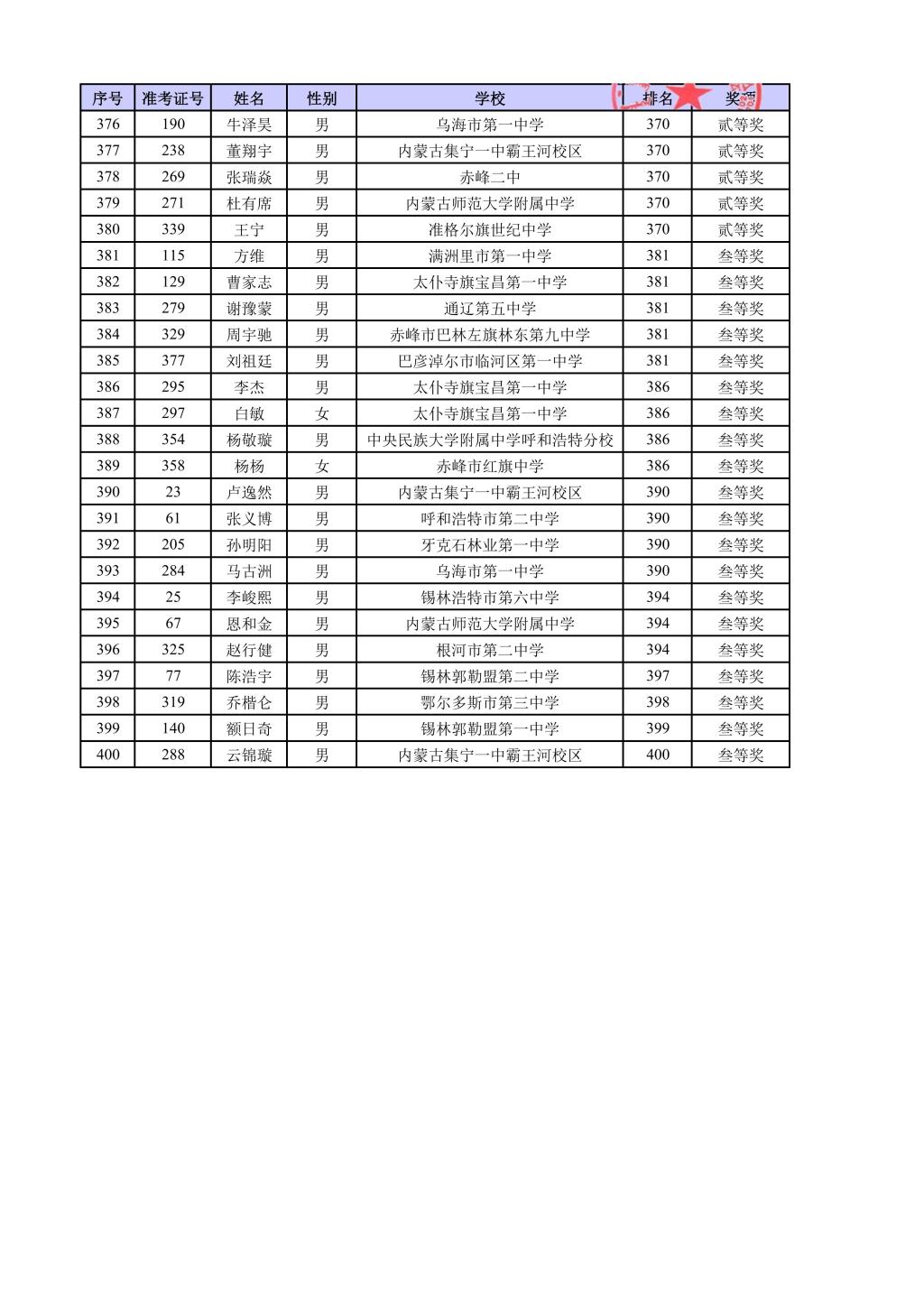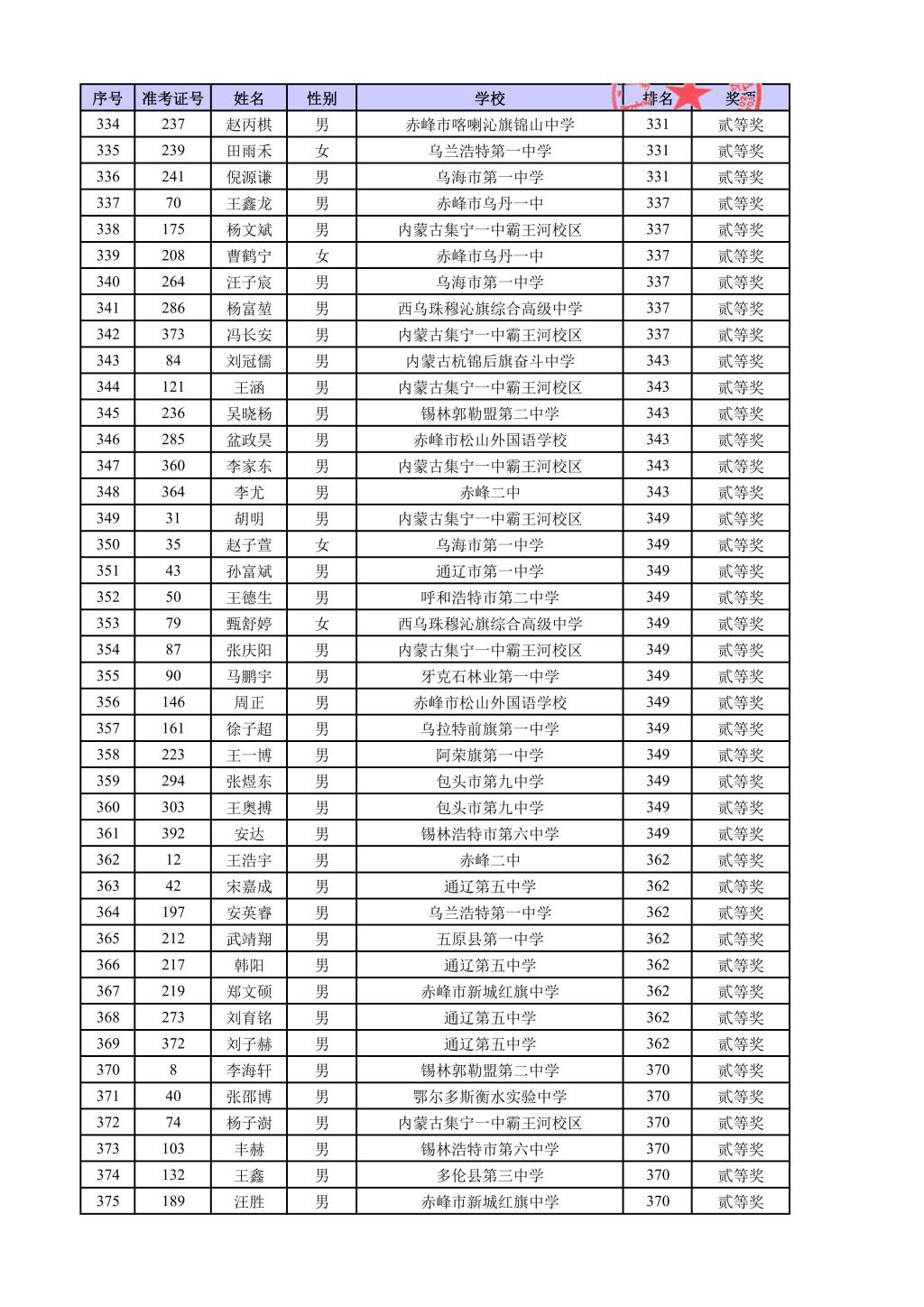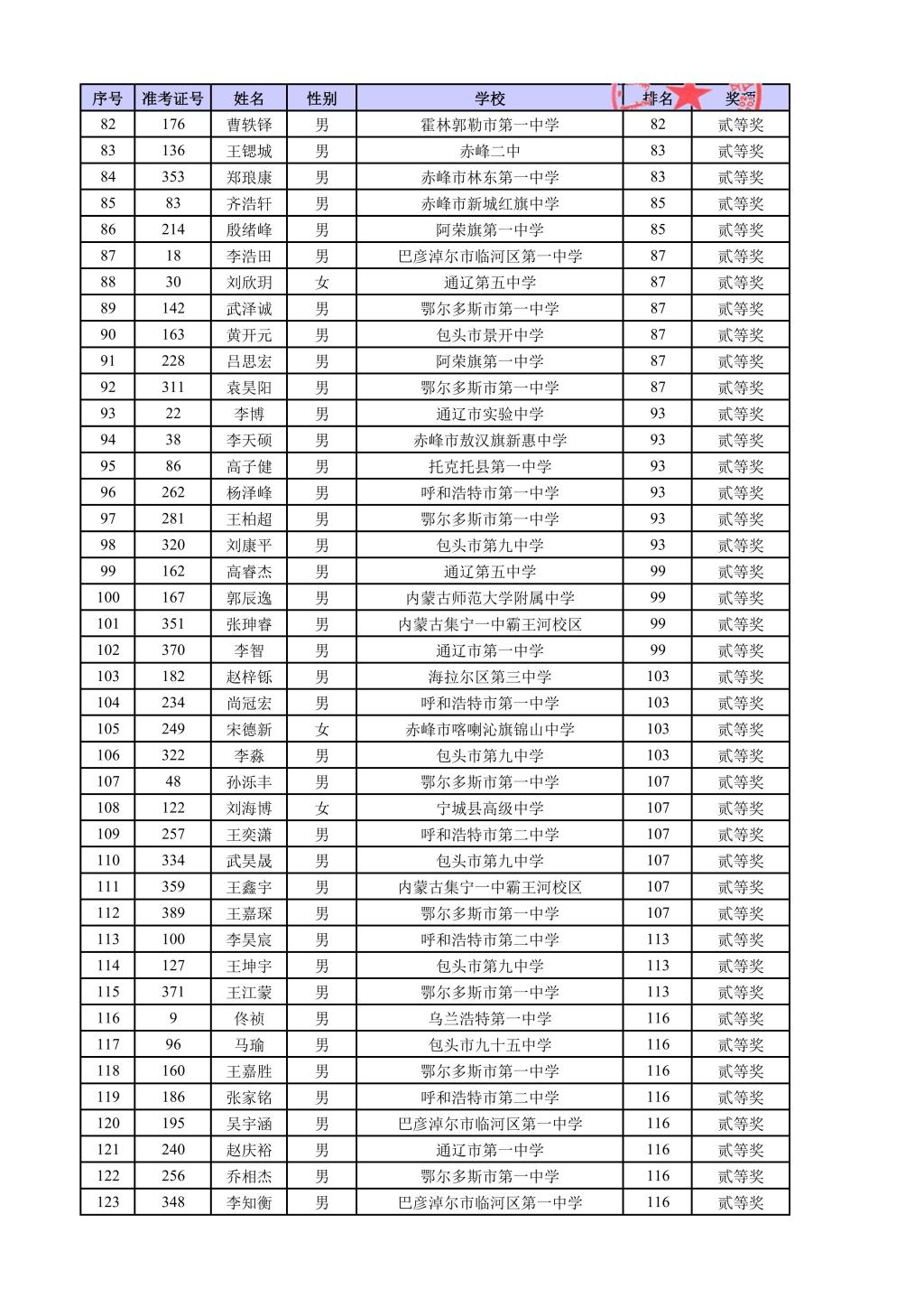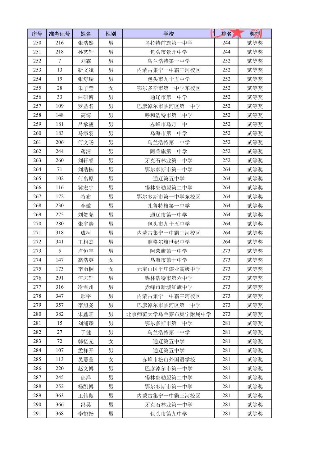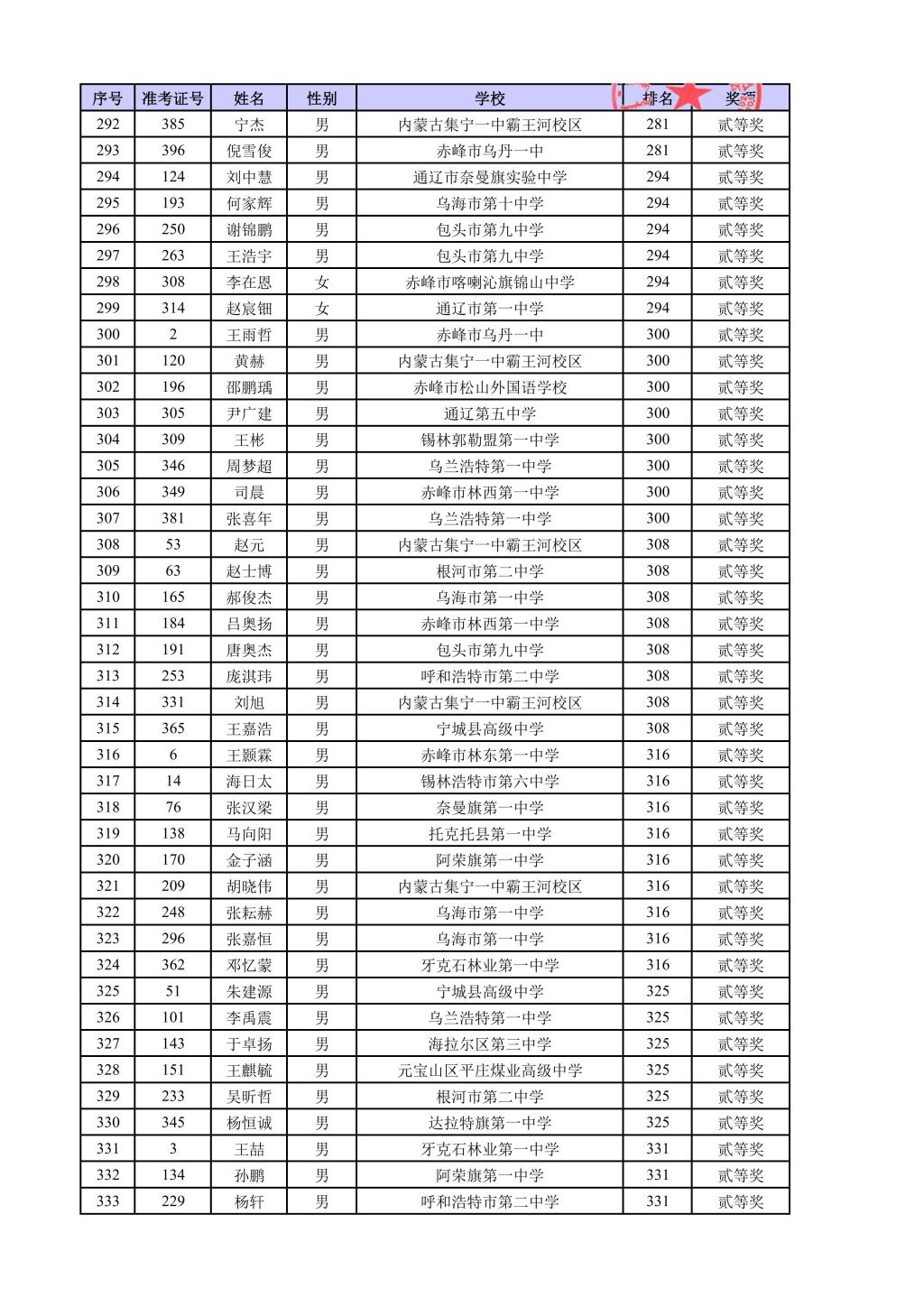 第42届全国中学生物理竞赛内蒙古自治区复赛结果公示