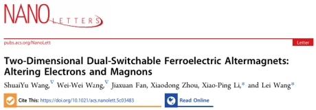 近日,我校yl23411集团官网王磊研究员和李小平研究员指导研究生在交错磁与铁电领域取得新进展,相关成果以“Two-Dimensional Dual-Switchable Ferroelectric Altermagnets: Altering Electrons and Magnons”为题发表在国际著名期刊Nano Letters。该研究得到了国家自然科学基金项目、内蒙古自然科学基金项目、内蒙古自治区草原英才项目、yl23411集团官网骏马计划等资助。